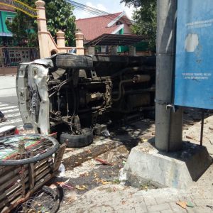 Setelah menghantam tiga pot bunga dan sebuah sepeda motor, mobil Phanter tidak berhenti. Mobil terguling ke kanan menabrak dua gerobak PKL yang biasa melintas didepan SMPN 3 Magetan.