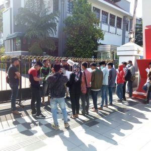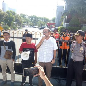 Hingga Pukul 14.12 Wib PLT. Kabid Penanganan Strategis Bakesbangpol Linmas Surabaya HP. Simanjuntak didampingi oleh Kapolsek Genteng Kompol Ari Trestiawan akhirnya menemui massa aksi.