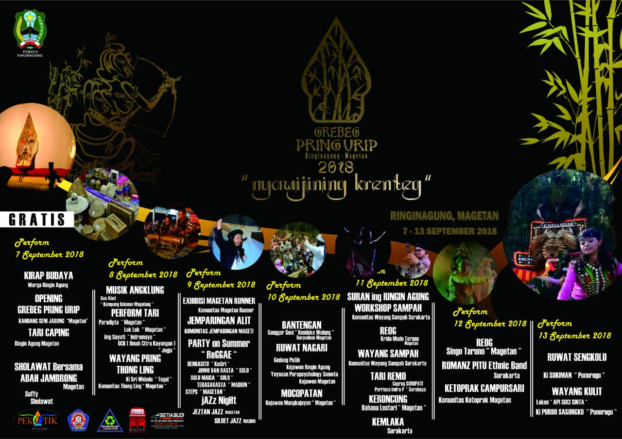 Menurut Harjuno yang biasa dipanggil Mbah Juno itu pagelaran pementasan berbagai kesenian kebudayaan selama sepekan itu sengaja mengambil tajuk PRING dimaksudkan bahwa Pring atau bambu adalah salah satu makhluk tumbuhan ciptaan Tuhan yang mengandung banyak filosofi yang dapat diterapkan dalam berkepribadian hidup bermasyarakat.