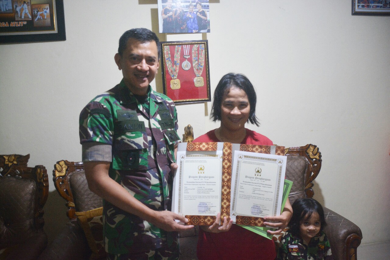 Disela kunjungannya tersebut, Danrem 071/Wijayakusuma memberikan Piagam Penghargaan kepada ibu Ferniwati Lase (istri Serda Arnold) atas prestasi yang merupakan kebanggaan keluarga besar Korem 071/Wk. Dan memberikan santunan tali asih kepada ibu Ferniwati Lase dan putri pertamanya yang juga atlet yunior Karate Nasional. (Agus/Red)