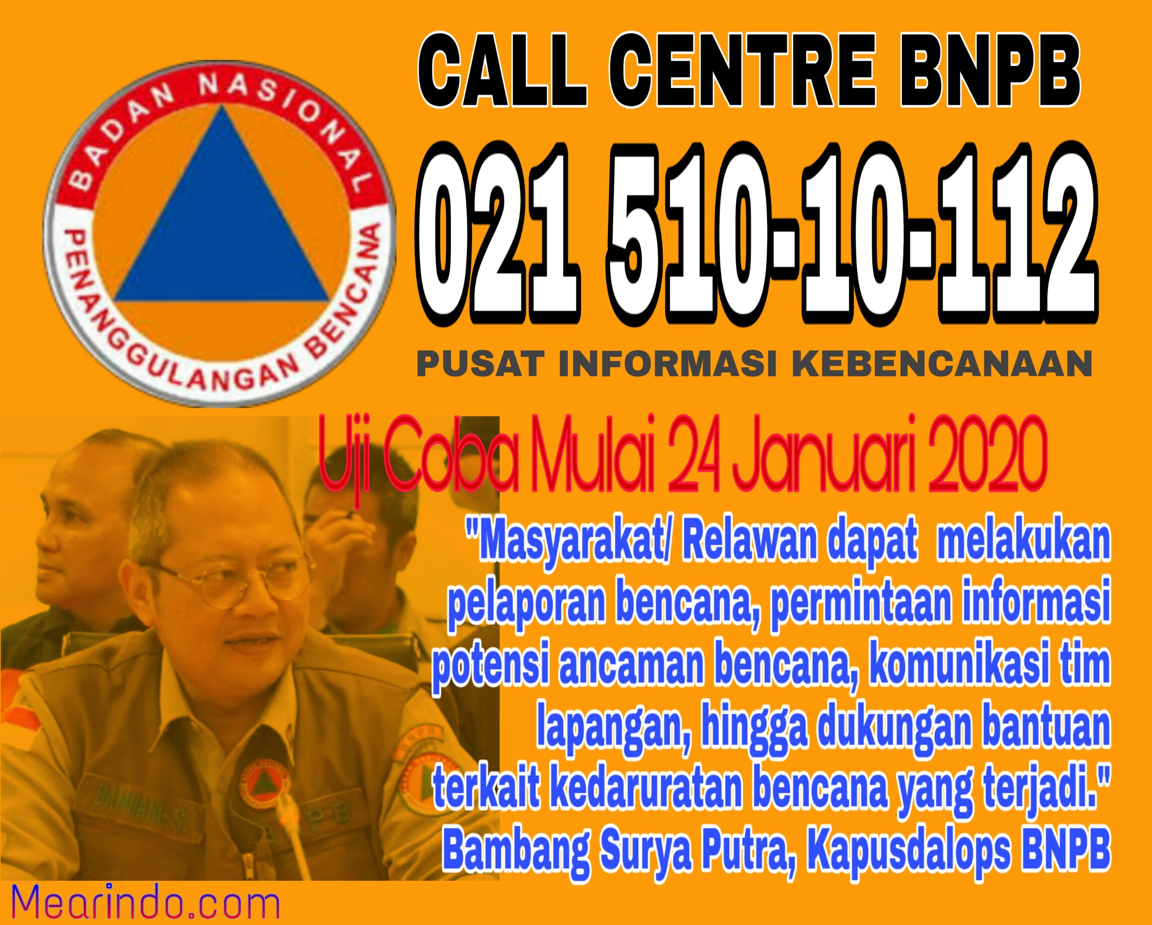 Nusantara, Mearindo.com – Demi memudahkan akses informasi terhadap kejadian kebencanaan di Indonesia Badan Nasional Penanggulangan Bencana (BNPB) melakukan terobosan de han meluncurkan Call Centre BNPB.(24/01/20)