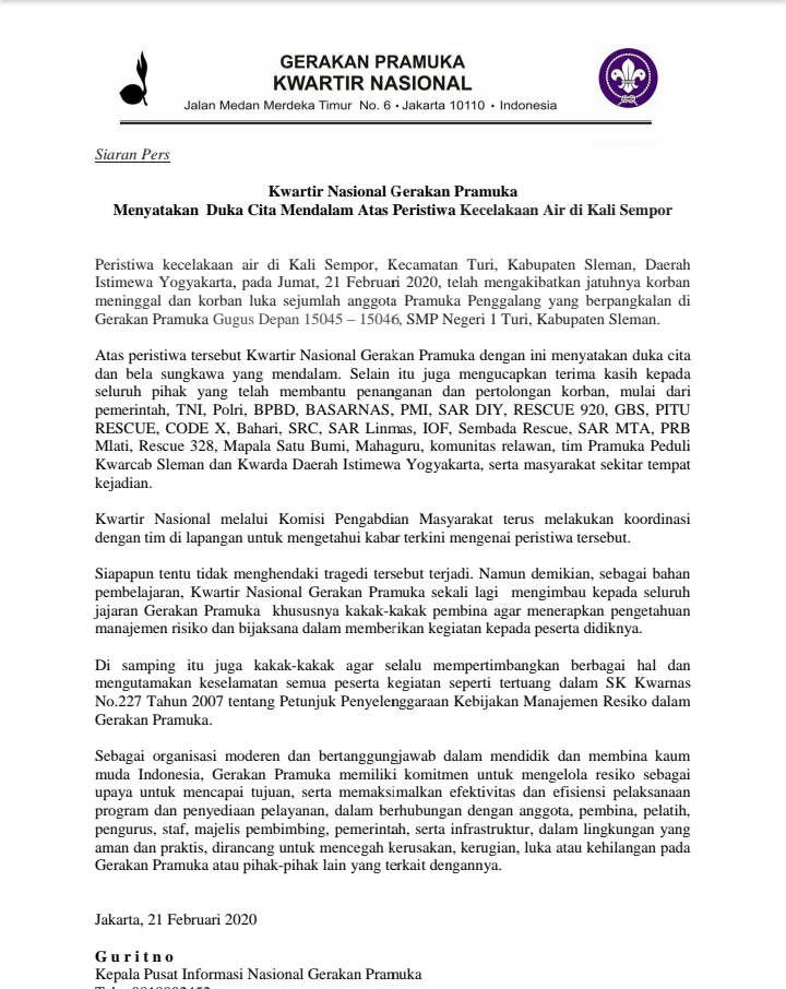 Atas peristiwa tersebut Kwartir Nasional Gerakan Pramuka dengan ini menyatakan duka cita dan bela sungkawa yang mendalam. Selain itu juga mengucapkan terima kasih kepada seluruh pihak yang telah membantu penanganan dan pertolongan korban, mulai dari pemerintah, TNI, Polri, BPBD, BASARNAS, PMI, SAR DIY, RESCUE 920, GBS, PITU RESCUE, CODE X, Bahari, SRC, SAR Linmas, IOF, Sembada Rescue, SAR MTA, PRB Mlati, Rescue 328, Mapala Satu Bumi, Mahaguru, komunitas relawan, tim Pramuka Peduli Kwarcab Sleman dan Kwarda Daerah Istimewa Yogyakarta, serta masyarakat sekitar tempat kejadian.
