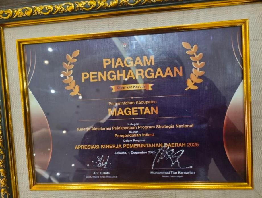 Piagam penghargaan diberikan kepada Pemerintah Daerah Kabupaten Magetan Kategori Kinerja Akselerasi Pelaksanaan Program Stategis Nasional Sektor Pengendalian Inflasi dalam “Apresiasi Kinerja Pemerintahan Daerah 2025” di Jakarta, Senin (1/12/2025)